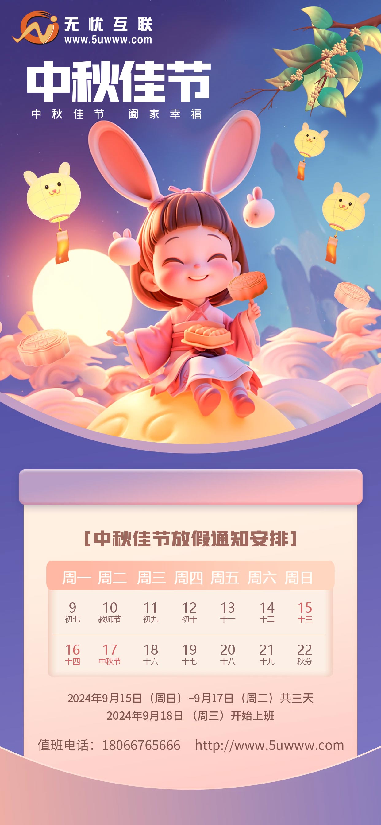 2024年9月15日~9月17日(周日~周二)放假,9月18日(周三)正常上班。放假期间如有需要帮助,可及时联系无忧互联值班人员,值班经理:秦爱芬 18092151999