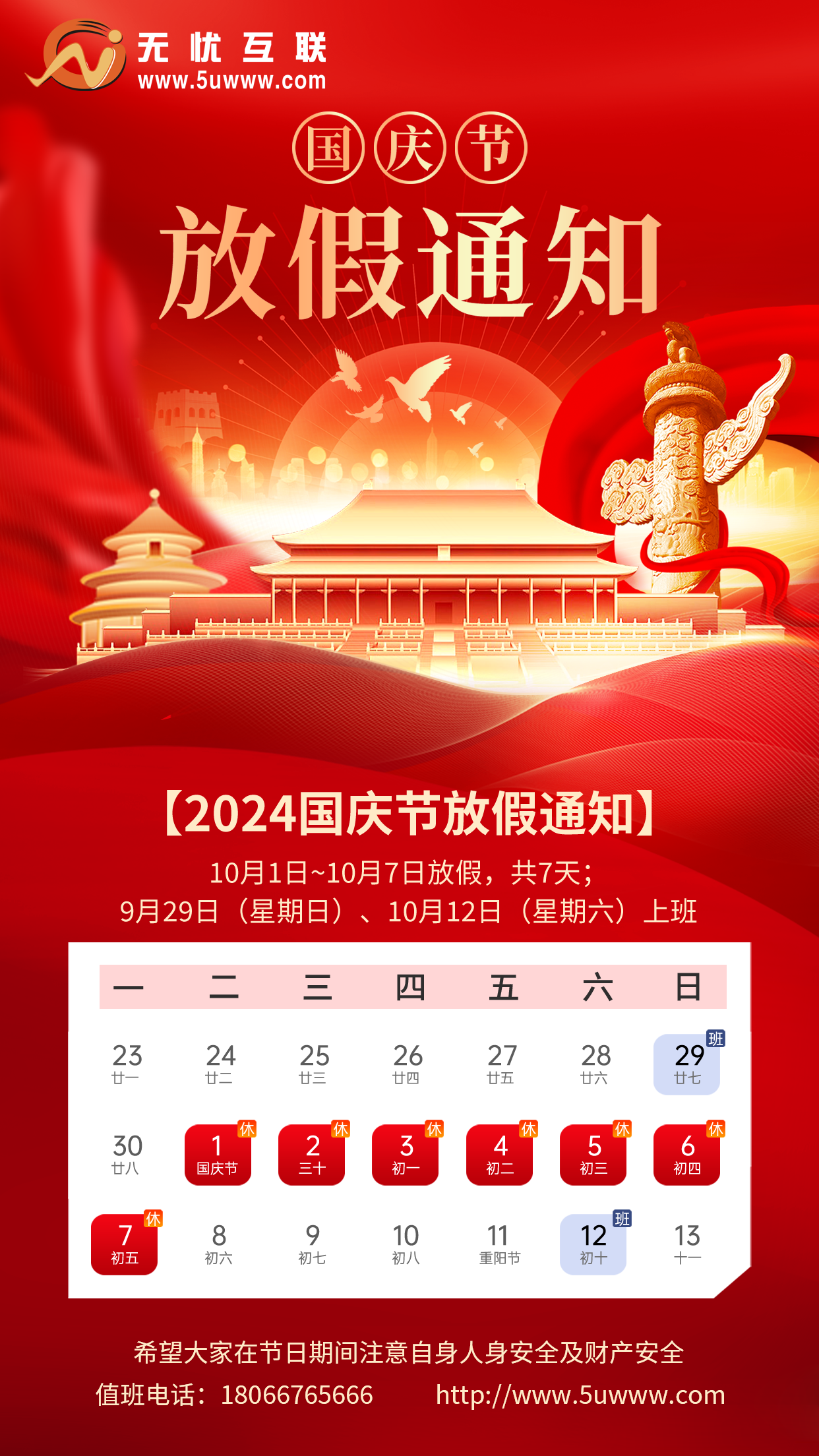 2024年10月1日~10月7日,国庆节放假调休,共7天。10月12日(星期六)正常上班。放假期间如有需要帮助,可及时联系无忧互联值班人员,值班经理:秦爱芬 18092151999